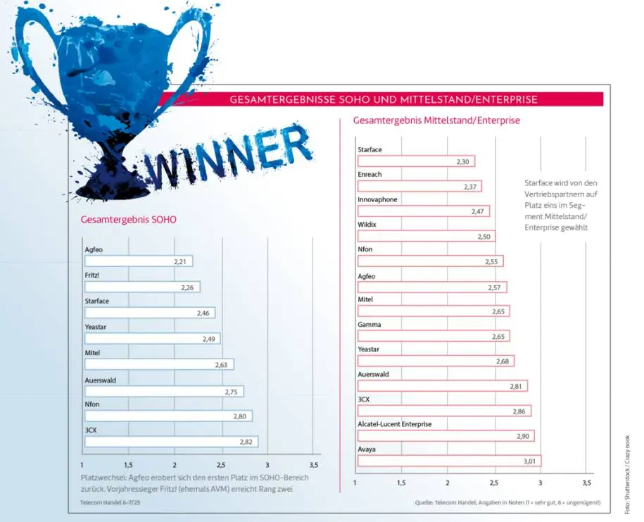 Nach dem zweiten Platz im Vorjahr steht Agfeo in diesem Jahr also wieder ganz oben auf dem Siegertreppchen im SOHO-Segment (Gesamtnote 2,21). Die Stärke der Bielefelder zeigt sich vor allem in den Einzelkategorien: Sieben von 16 Einzelkategorien gehen an Agfeo, darunter zentrale Bereiche wie Support, Partnertreue und Funktionsvielfalt – allesamt Kategorien, die Agfeo bereits im Vorjahr für sich entscheiden konnte. Auch bei Partnerprogramm, Projektunterstützung, Prozessen und Schulungen (hier allerdings gemeinsam mit FRITZ!) liegt der Hersteller vorne. Dabei loben die Fachhändler bei AGFEO vor allem die kurzen Wege zu Vertrieb, Support und Entwicklung – und die breite Produktpalette.