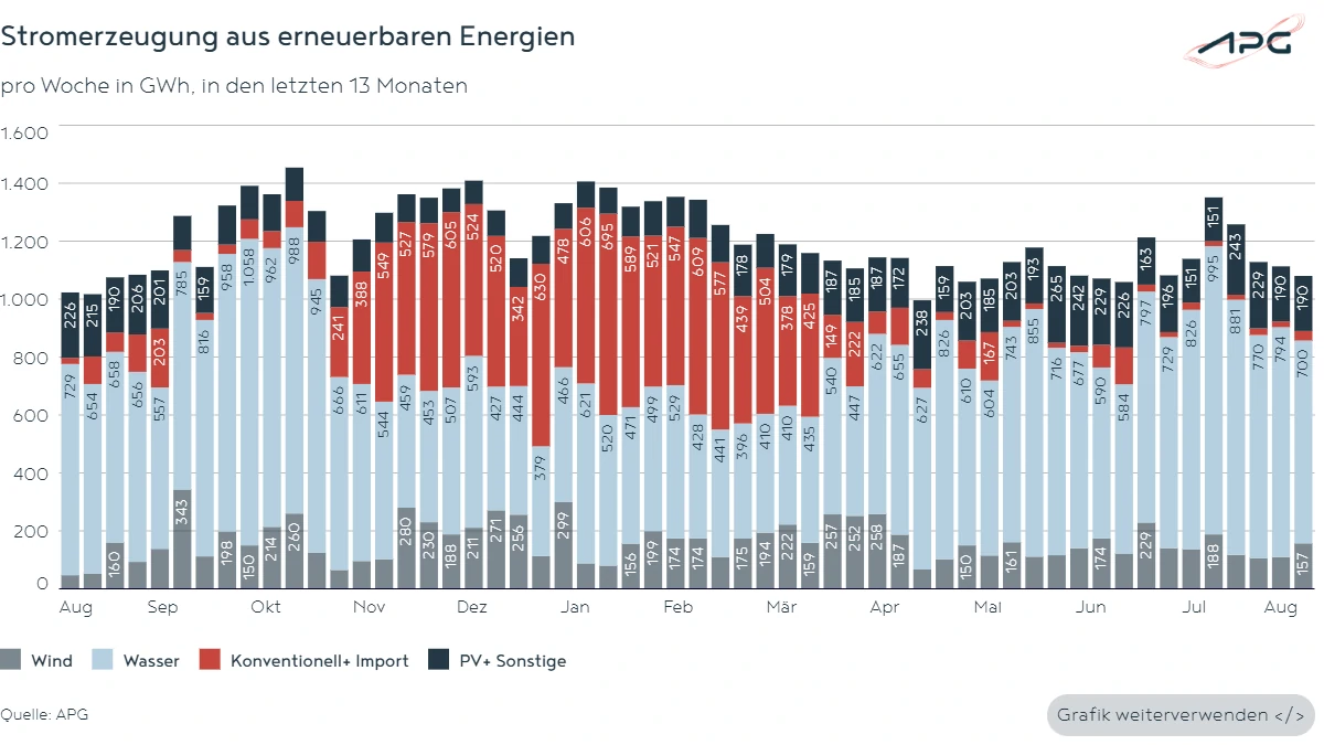Die APG-Factbox zeigt im August, dass erneuerbare Potenziale aufgrund fehlender Netzkapazitäten nicht voll genutzt werden können.