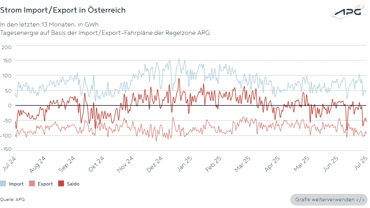 Per Saldo ergab sich über den Gesamtmonat Juli 2025 in Österreich ein Export in der Höhe von 458 GWh (auf Basis der Fahrpläne), wobei an 22 Tagen bilanziell Strom ins Ausland exportiert werden konnte. Auch im Vergleichsmonat des Vorjahres war Österreich Export-Land, wobei der Saldo mit 997 GWh damals höher ausfiel und an allen 31 Tagen des Monats ein bilanzieller Stromexport verzeichnet werden konnte.