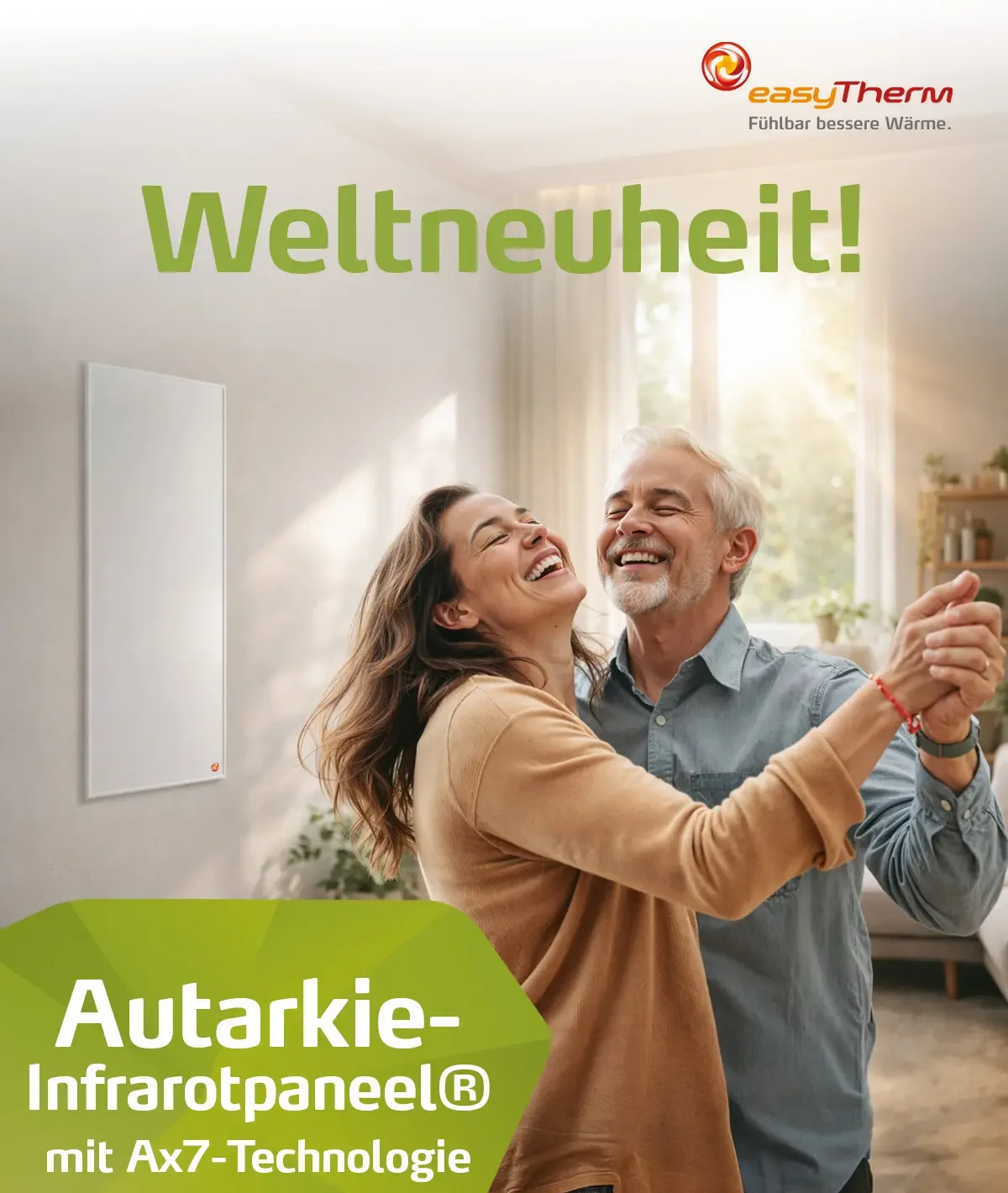 easyTherm bringt mit der neuen Ax7‑Technologie das erste Autarkie-Infrarotpaneel Europas auf den Markt. Die Innovation ermöglicht gemeinsam mit Photovoltaik und Batteriespeichern ein neuartiges, hocheffizientes und hochgradig energieautarkes Heizungskonzept – ideal für Private mit PV-Anlagen sowie die Bau‑ und Immobilienbranche.
