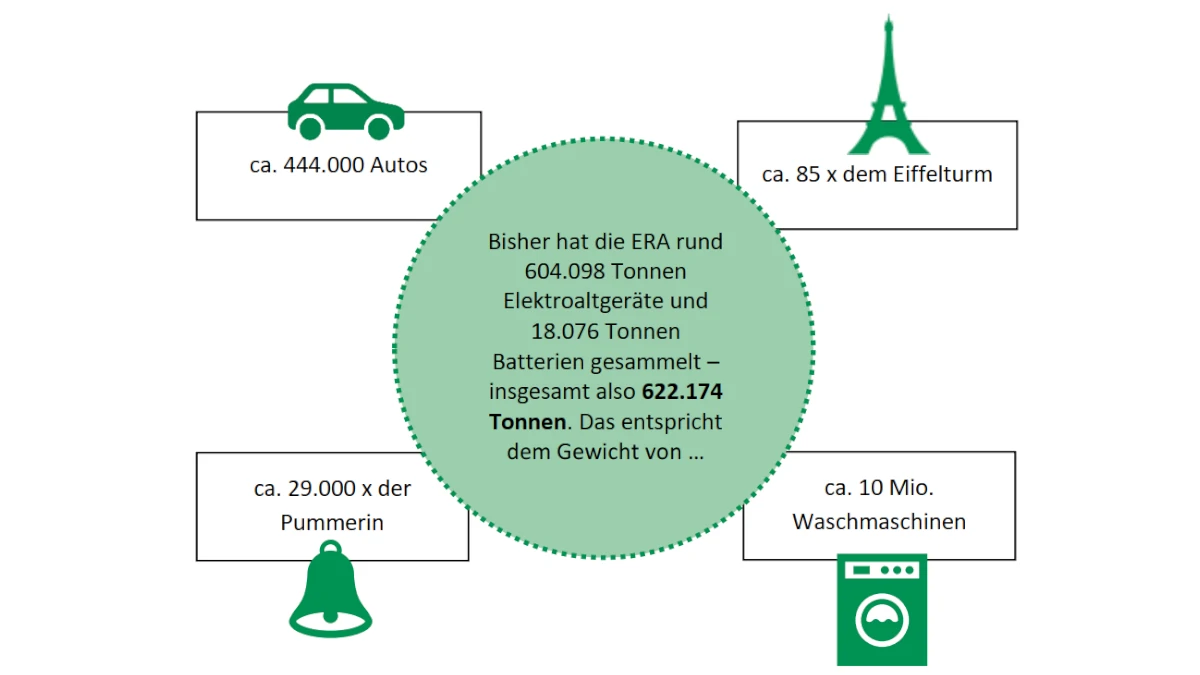 2005 fiel mit der Elektroaltgeräteverordnung in Österreich der Startschuss für eine neue Elektroaltgeräte-Sammlung. Als erstes Sammel- und Verwertungssystem, das seinen Kund:innen eine Entpflichtung gemäß der Verordnung ermöglichte, wurde im August 2005 die Elektro Recycling Austria GmbH (ERA) vom Umweltministerium genehmigt. Nach 20 Jahren ist die ERA mit 40 % Gesamtmarktanteil führender Player der Branche und zieht eine erfolgreiche Bilanz: Mehr als 604.000 Tonnen Elektrogeräte hat sie seither gesammelt. 2009 erweiterte das Tochterunternehmen der Altstoff Recycling Austria AG (ARA) dem österreichischen Batteriegesetz folgend seinen Geschäftsbereich auch auf die Batteriesammlung und konnte bisher mehr als 18.000 Tonnen Altbatterien sammeln.