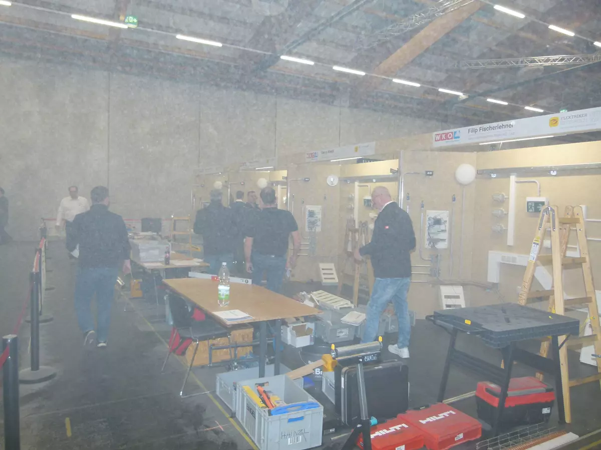 Was hier wie Nebel aussieht, war die Staubbelastung für die bewertende Jury durch die Staub-kehrenden Maurer vom Nebenstand.