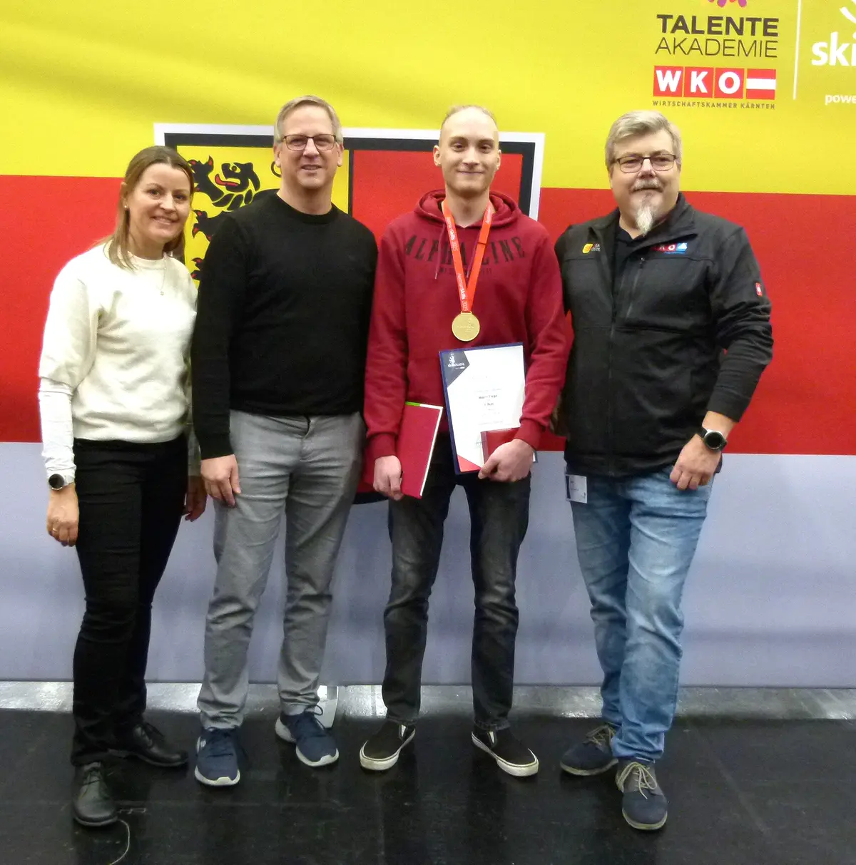 Erfolg durch gutes Teamwork im KELAG Ausbildungscampus (v.l.n.r.): Katharina Zimmerberger, HR-Leitung, Martin Wegscheider, Ausbilder Elektrotechnik (beide KELAG Ausbildungscampus St. Veit), Staatsmeister Marvin Varga und der sichtlich stolze Kärntner Lehrlingswart Michael Veratschnig.