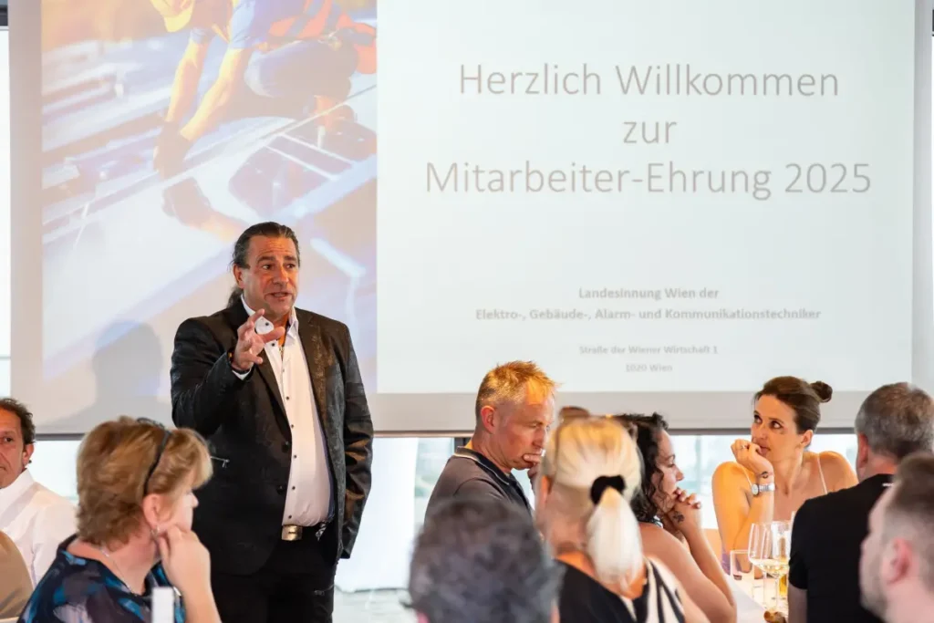 Der alte & neue Wiener Innungsmeister – und BIM – Christian Bräuer betonte in seiner Ansprache die außergewöhnliche Bedeutung der geehrten Mitarbeiter:innen: „Ich bin wahnsinnig stolz, dass ihr mit uns gemeinsam die Elektrobranche mitgestaltet und weiterentwickelt. Planbarkeit und langfristige Perspektiven sind mitentscheidend für den Unternehmenserfolg. Betriebe, die langfristig mit ihren Mitarbeiter:innen zusammenarbeiten, schaffen Vertrauen.“