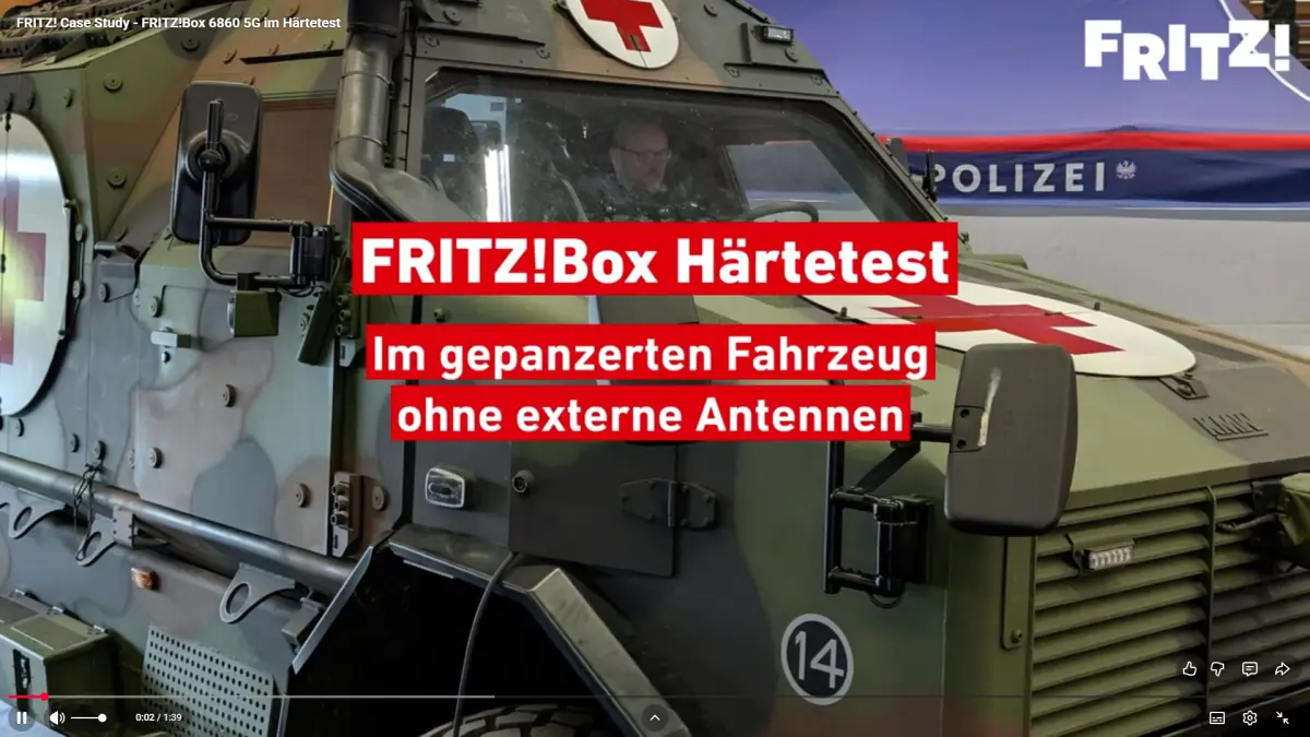 Auf der Rettermesse in Wels hat man die FRITZ!Box 6860 5G einem Empfangstest in einem  gepanzerten Fahrzeug unterzogen.