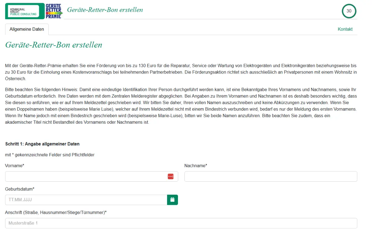 Die Abwicklung der Geräte-Retter-Prämie erfolgt über www.geräte-retter-prämie.at, die einzige offizielle Plattform zur Förderung. Und seit heute können Konsumentinnen und Konsumenten ihren Geräte-Retter-Bon auf der Website einfach online beantragen. Nach Eingabe der persönlichen Daten und der Bankverbindung wird der Bon per E-Mail übermittelt und kann digital oder ausgedruckt bei einem Partnerbetrieb eingelöst werden.