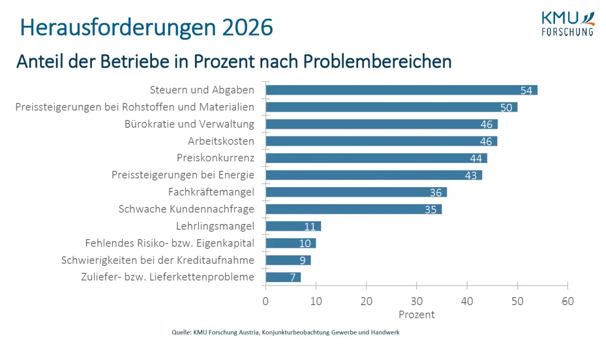 Ein dringliches Thema ist auch die Ausbildung von Lehrlingen. Das Gewerbe und Handwerk war mit knapp 44.000 Lehrlingen Ende 2025 weiterhin der mit Abstand größte Lehrlingsausbilder des Landes. Die Betriebe klagen jedoch über mangelnde Unterstützung, während der Aufwand massiv gestiegen ist – zeitlich, personell, finanziell. Denk weist darauf hin, dass sich die Lehrlingseinkommen in den vergangenen zehn Jahren verdoppelt haben. „Die Ausbildungsbetriebe investieren pro Jahr 3 Milliarden Euro in die Lehrlinge. Sie sorgen dafür, dass die Lehre attraktiv bleibt. Es ist der Staat, der sich aus der Verantwortung stiehlt.“