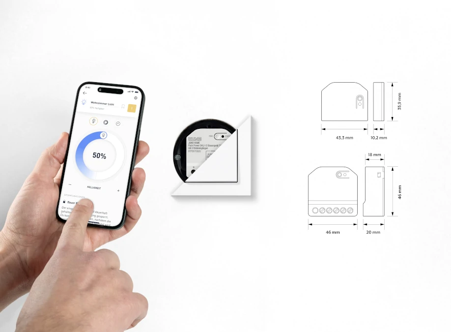 Für Anwendungen, bei denen Licht geregelt werden soll, bietet Jung spezialisierte Pucks: Der Dimmer 1-fach (BTPD1B2U) ermöglicht das stufenlose Regeln dimmbarer Leuchten und wird im Leuchtenbaldachin oder in Zwischendecken installiert. Das Power DALI-2 Steuergerät (BTPDS-TEB2U) mit Tunable-White Funktion versorgt bis zu 64 DALI-Teilnehmer – auch in kleineren gewerblichen Anwendungen wie Büros oder Besprechungsräumen. Der Jalousieaktor 1-fach steuert 230-Volt-Antriebe für Rollläden, Jalousien und Markisen wahlweise über die gewohnten Taster an der Wand oder über die Jung Home App. Die Steuerung lässt sich individuell anpassen, bei Jalousien kann zudem der Lamellenwinkel präzise eingestellt werden. Das ermöglicht mehr Komfort und unterstützt eine energieeffiziente Gebäudenutzung