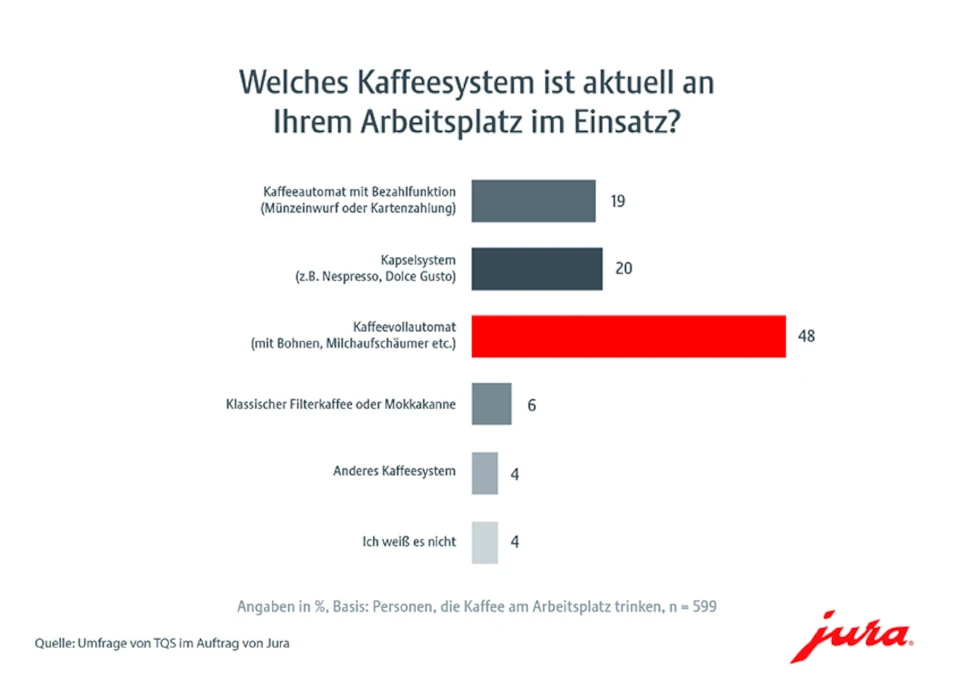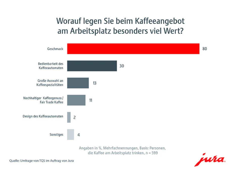 Die heimischen Arbeitnehmenden stellen an ihr Bohnengebräu hohe Ansprüche: 80 % sagen, dass der Geschmack entscheidend ist. Für 30 % ist die Bedienbarkeit des Kaffeevollautomaten am wichtigsten und 13 % legen besonders viel Wert auf eine große Auswahl an Spezialitäten. Anforderungen, denen die Vollautomaten der Schweizer Traditionsmarke Jura mehr als gerecht werden.