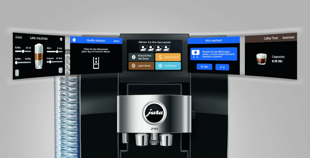 Das nach außen gewölbte Bedienfeld lädt zum Interagieren ein, während die Tassenplattform eine beeindruckende Bühne bildet. Dank des ideal ausgerichteten 4,3′ Touchscreen‑Farbdisplays entfaltet die Z10 ihre volle Brillanz und lässt die vier Genusswelten erstrahlen. Ausgestattet mit dem Präzisionsmahlwerk P.R.G.2+ beherrscht die Z10 fünf verschiedene Brühprozesse und brüht 51 Kaffeespezialitäten aus allen vier Jura Genusswelten direkt in die Tasse. Innovative Technologien wie Coffee Timer, Koffeinregler, Milk Assistant und Quality Assistant machen das Paket komplett und die Jura Z10 zur unverzichtbaren Versuchung in diesem Frühling.