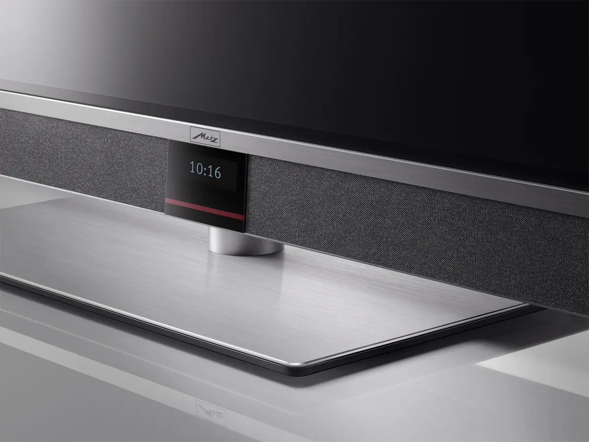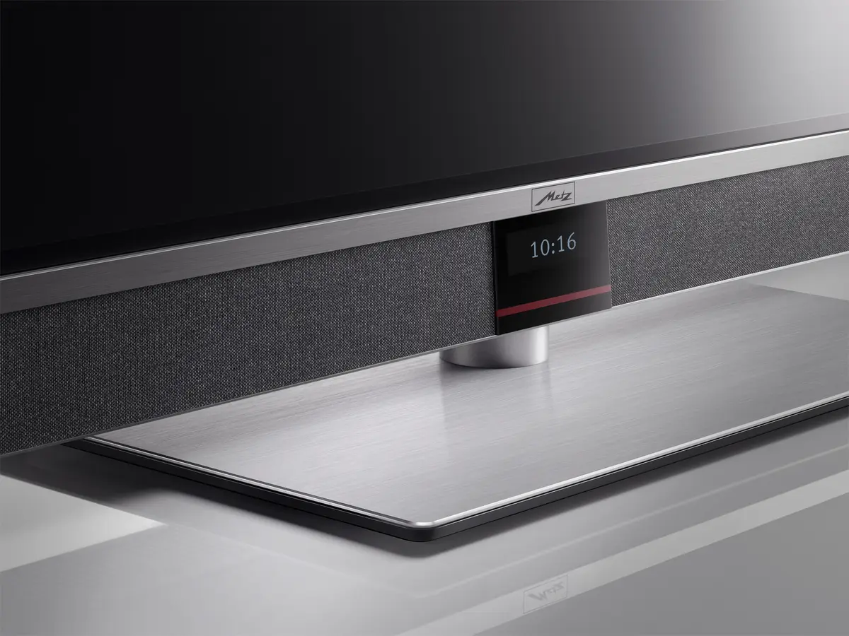 Für ein volles, detailreiches Klangbild sorgt das leistungsstarke MetzSound-Pro-System mit Zwei-Wege-Bauweise, Bassreflex-Kanal und sechs nach vorne abstrahlenden Lautsprechern, dezent verborgen hinter hochwertigem Akustikstoff in dezentem Silbergrau. Kristallklare Höhen, präsente Mitten und kräftige Bässe sorgen für ein ebenso beeindruckendes Erlebnis wie das Bild.