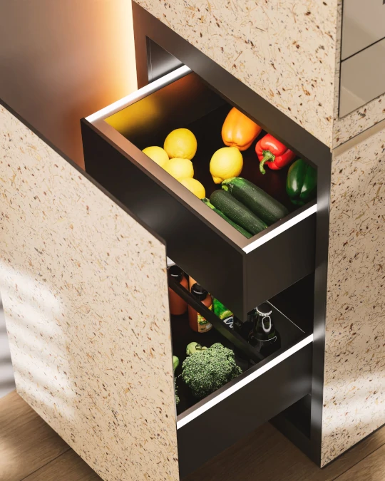 Im Zentrum stehen modulare und flexible Kochmöbel, die mehr sind als eine Küche. Sie sind Kochstation, Esstisch und Arbeitsplatz zugleich. Die Idee dahinter ist einfach: statt Räume zu trennen, greifen Funktionen ineinander – und passen sich durch flexible und verstellbare Elemente dem Alltag und nicht dem Grundriss an. Morgens Arbeitsplatz, mittags Kochfläche, abends Treffpunkt: Das Möbelstück lässt sich je nach Situation anders nutzen.