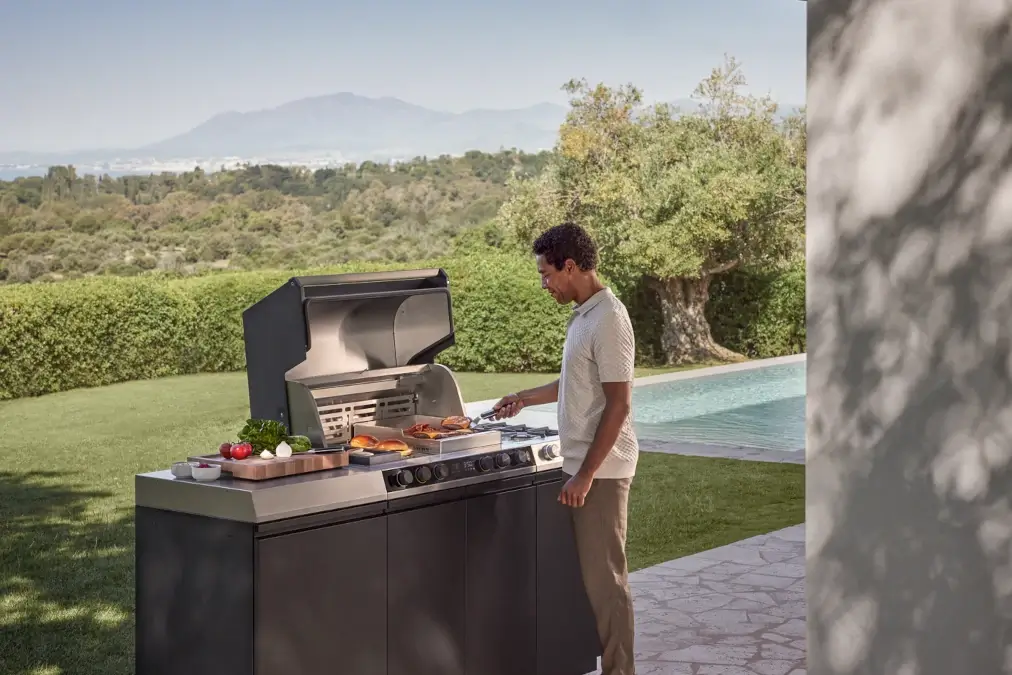 Über 60 Zubehöre bringen neben weiteren Zubereitungsarten auch mehr Flexibilität und Komfort nach draußen – wie zum Beispiel Haken und Halterungen für Modulschränke, die die Grillzange, den Spachtel oder die passgenaue Abdeckhaube immer griffbereit halten. So fügt sich die Küche dank ihres minimalistischen Designs als Highlight in jeden Outdoor-Bereich ein.