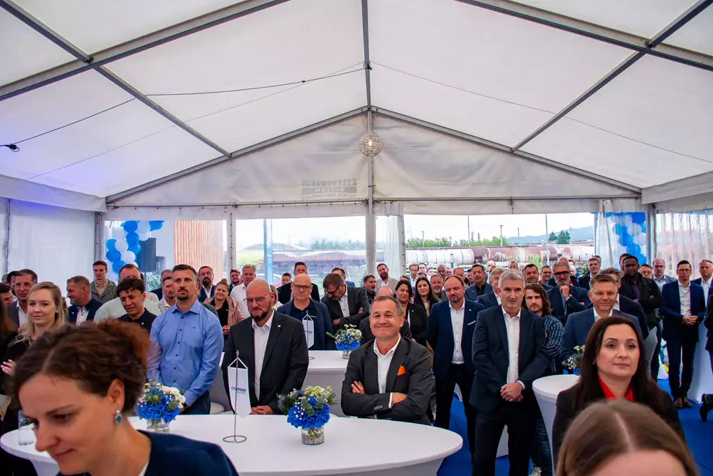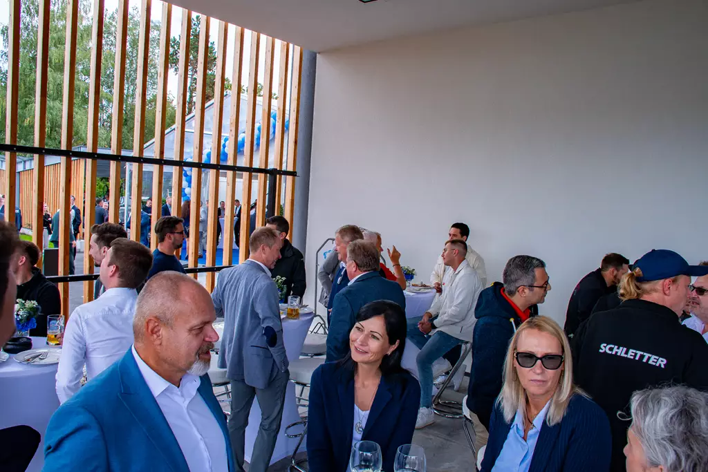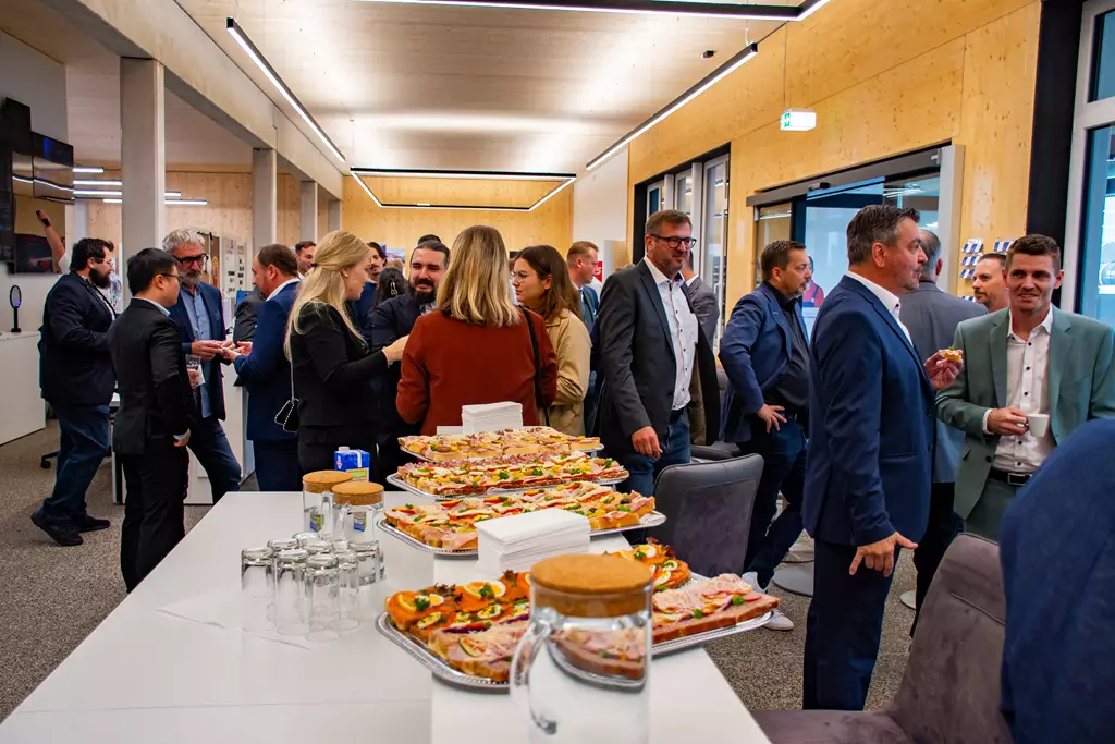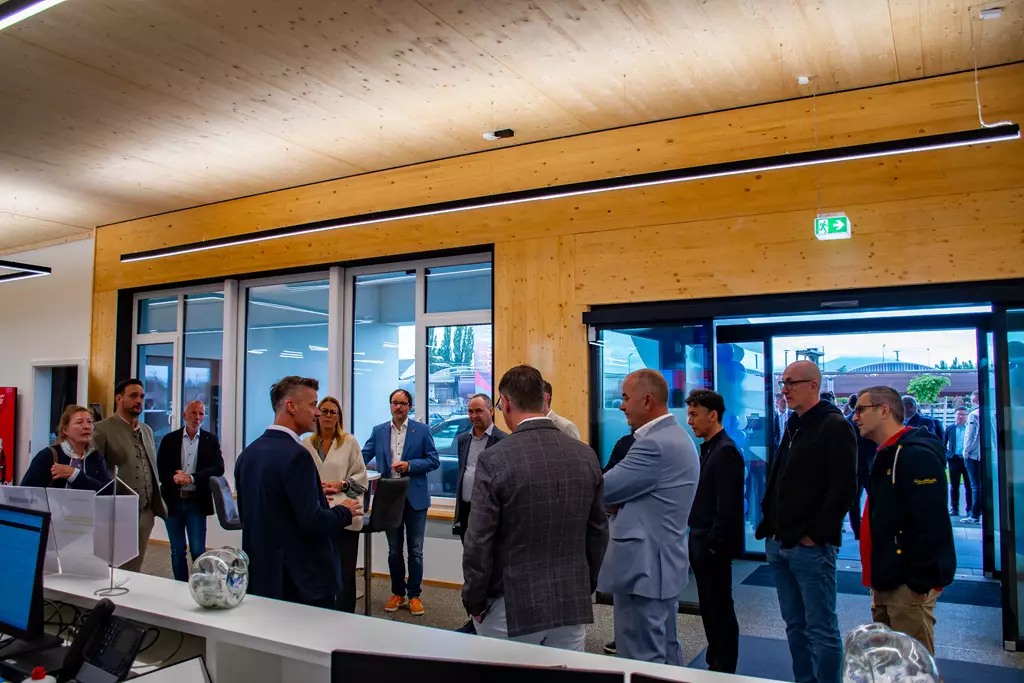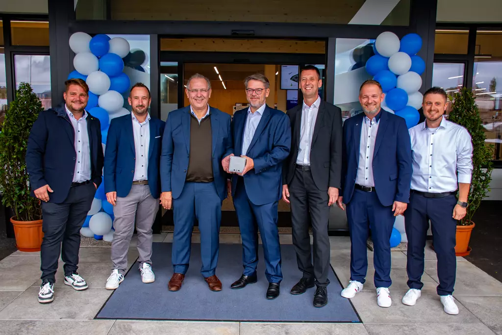 Strahlende Gesichter in der Flatschacher Str. 61. Unter reger Anteilnahme von Kunden, Partnern und Lieferanten wurde die jüngste Niederlassung mit dem Durchtrennen einer blauen Schleife offiziell eingeweiht. Bereits im Juni hatte das Team das neue Gebäude bezogen und ist seitdem für seine Kunden im Einsatz. „Es macht uns allen hier Freude, von dem neuen Standort aus für unsere Kund:innen tätig sein zu dürfen,“ schwärmt Niederlassungsleiter Roland Filler. „Hier haben wir großartige Möglichkeiten, zu demonstrieren, tiefer in den Service zu gehen und unsere Stärken in Knowhow und Logistik voll auszuschöpfen.“