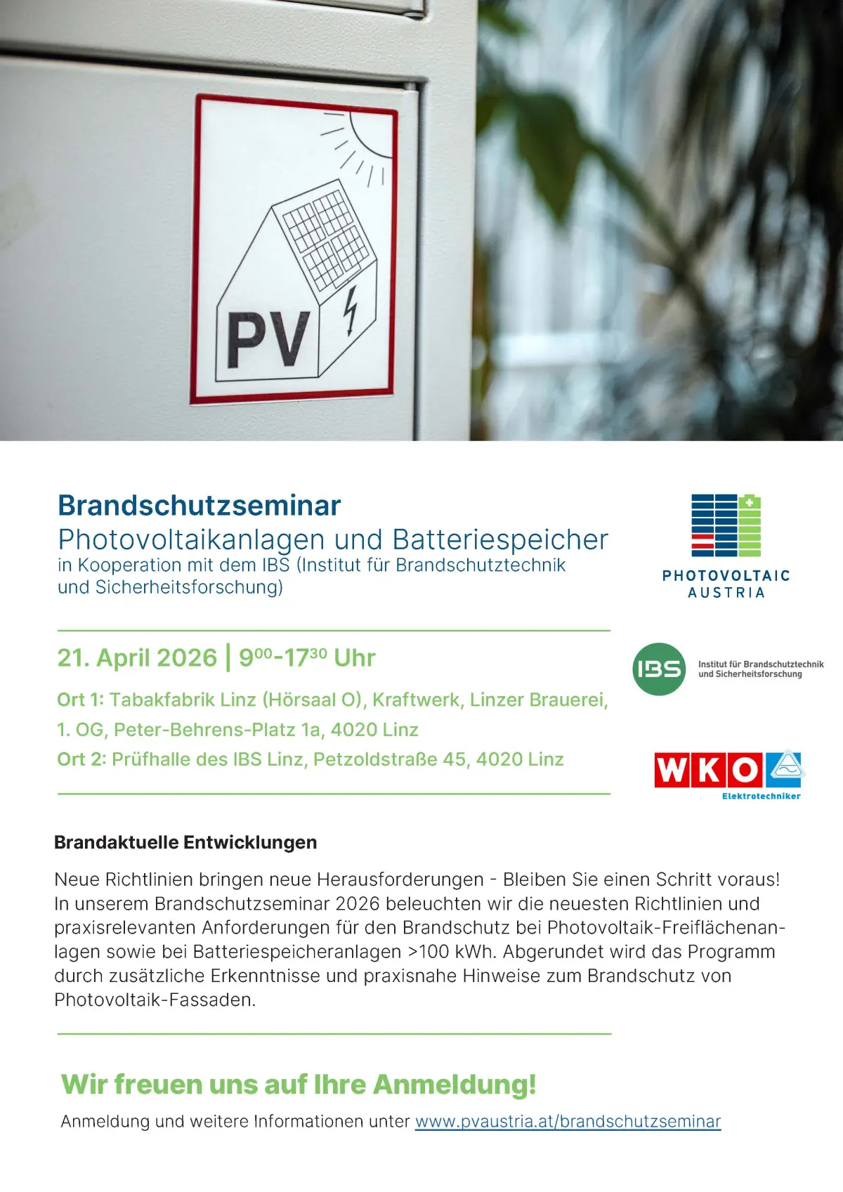 Abgerundet wird das reichhaltige Programm zudem durch zusätzliche Erkenntnisse und praxisnahe Hinweise zum Brandschutz von Photovoltaik-Fassaden. PV Austria- und Innungs-Mitglieder (Elektrotechnik) profitieren von ermäßigten Teilnahmegebühren.