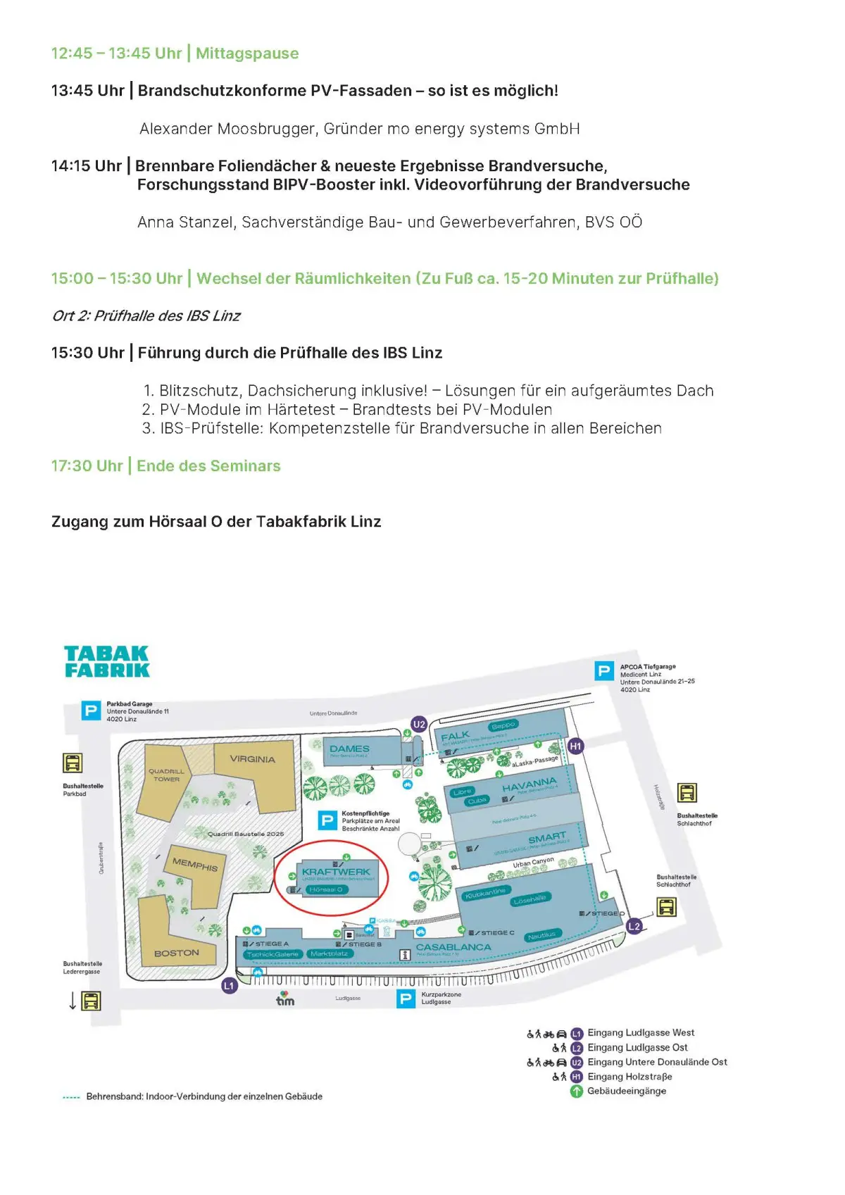 * Die Führung durch die Prüfhalle des IBS Linz findet nur bei physischer Teilnahme am Seminar statt und wird nicht online übertragen. Die Online Übertragung endet somit um 15:00 Uhr!