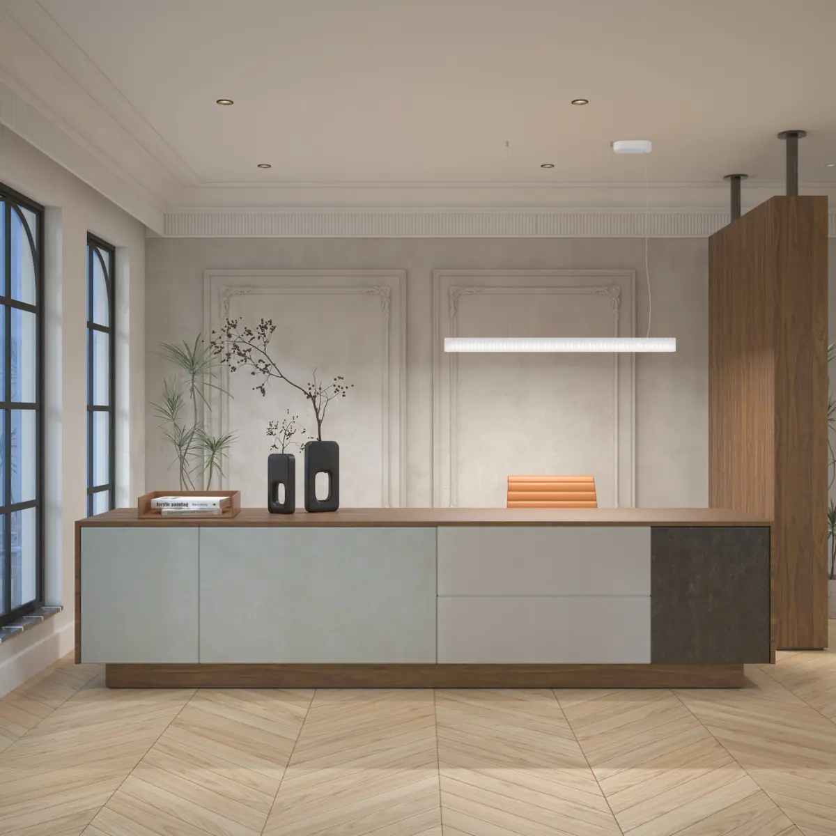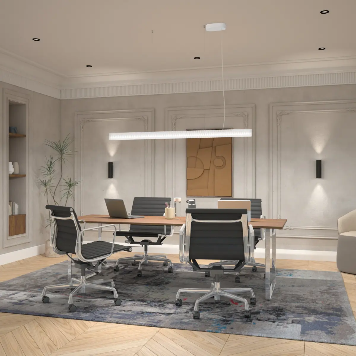 Der Neuzugang lässt sich nahtlos in intelligente Beleuchtungssysteme wie Interact integrieren und mit verschiedenen Sensoren koppeln. Je nach Bedarf ist die Leuchte dann dazu in der Lage, auf Bewegung zu reagieren und ihre Beleuchtungsintensität an das einfallende Tageslicht anzupassen. Die Pendelleuchte ist mit verschiedenen Lumenpaketen sowie mit kabelgebundenen und kabellosen Steuerungsmöglichkeiten erhältlich. Die linearen Komponenten sind so konzipiert, dass sie wie Puzzleteile zusammenpassen.