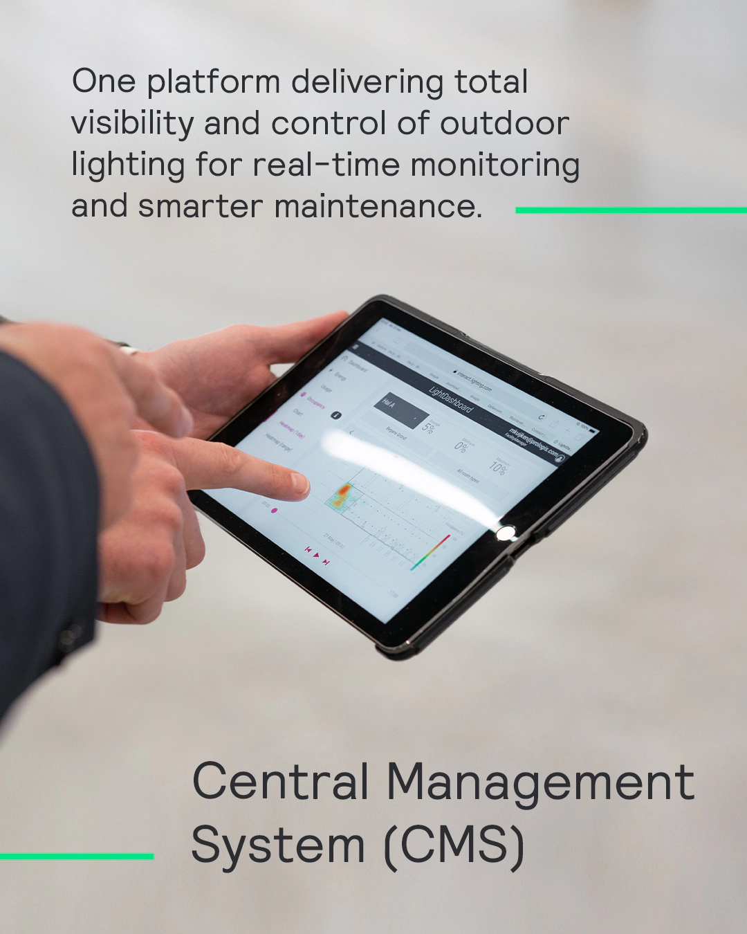 • Das zentrale Managementsystem (CMS) erlaubt die Überwachung, Steuerung und Verwaltung von mehreren unterschiedlichen Außenbeleuchtungsnetzwerken aus der Ferne über eine einzige Plattform. Der Zugriff auf Echtzeit-Transparenz- und Leistungsdaten verbessert die Wartungseffizienz, reduziert den Energieverbrauch und gewährleistet eine konsistente Beleuchtungsperformance in Städten und Straßennetzen.