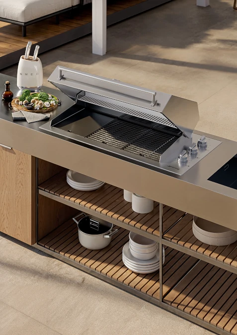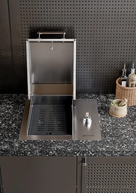 Damit der Grill möglichst effizient genutzt werden kann, hat Smeg die Edelstahlhaube speziell thermisch isoliert. Dadurch bleibt die Außentemperatur niedrig und niemand kann sich daran die Finger verbrennen. Darüber hinaus wurde die Abdeckung aus hochwertigem Edelstahl nach AISI 316 gefertigt. Dieses äußerst widerstandsfähige und korrosionsbeständige Material kommt sonst in maritimen Umgebungen zum Einsatz. Und deshalb trotzt auch der Outdoor-BBQ Jahr für Jahr selbst widrigen Witterungseinflüssen. Der Spritzschutz aus 2 mm starkem Edelstahl und die Arretierung der geöffneten Abdeckhaube sind zusätzliche Sicherheitsfeatures.