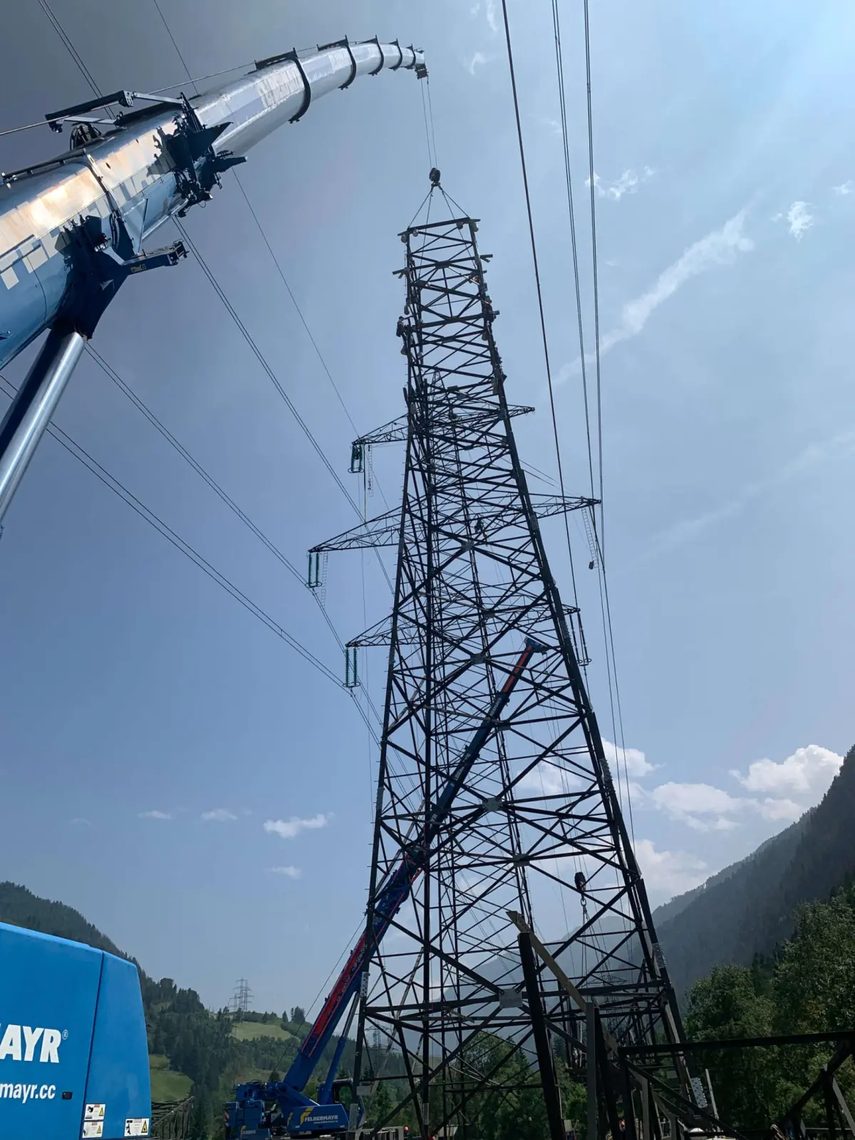 Für die Einbindung der 380-kV-Leitung zwischen den Umspannwerken Lienz und Tauern (Kaprun), die bisher am Standort vorbeiführte, ließ APG am neuen Werksareal einen neuen 380-kV-Strommasten errichten – unter beengten Platzverhältnissen und in engem Zeitfenster. Die Arbeiten übernahm die Cteam Österreich Leitungsbau GmbH aus Matrei: Zwölf Monteure – die „Manda“ – montierten die 70 Tonnen schwere Stahlgitterkonstruktion mithilfe eines 160-Tonnen-Autokrans. Anschließend wurden die Leiterseile eingebunden und mit dem neuen Umspannwerk verbunden.