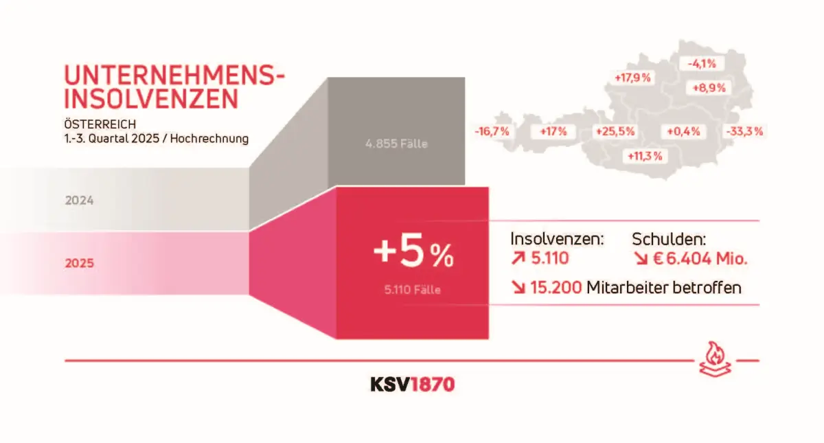 Die Gefahr eines dritten Rezessionsjahres infolge ist in Österreich weiterhin nicht gebannt, die heimischen Unternehmen stehen unverändert unter großem finanziellen Druck. Zwar gab es zuletzt zaghafte Anzeichen einer leichten Stabilisierung der wirtschaftlichen Lage, diese reichen jedoch bei weitem nicht aus, um die Insolvenzwelle einzudämmen. Demzufolge ist die Zahl der Unternehmensinsolvenzen zum Ende des dritten Quartals 2025 gegenüber dem Vorjahr um 5,3 Prozent auf insgesamt 5.110 Firmenpleiten gestiegen.
