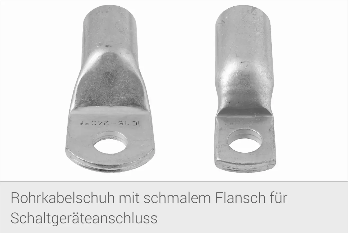 Da es besonders bei Schaltgeräten immer öfter vorkommt, dass aufgrund der immer kleiner werdenden Bauform auch die Anschlussmaße für herkömmliche Kabelschuhe zu klein sind, benötigt man hier einen entsprechend angepassten Rohrkabelschuh. Hier zeichnet sich der Rohrkabelschuh für Schaltgeräteanschluss durch einen sehr schmalen Flansch aus. Einerseits ist der Flansch wesentlich schmaler ausgeführt, andererseits im Flanschbereich auch etwas dicker, da der Flansch den Querschnitt übertragen können muss. Bei Intercable Tools gibt es, als einziger Hersteller, den Rohrkabelschuh mit schmalem Flansch sowohl für Rohrkabelschuhe der R-Reihe (ICRXXXS) als auch der F-Reihe (ICFXXXS).