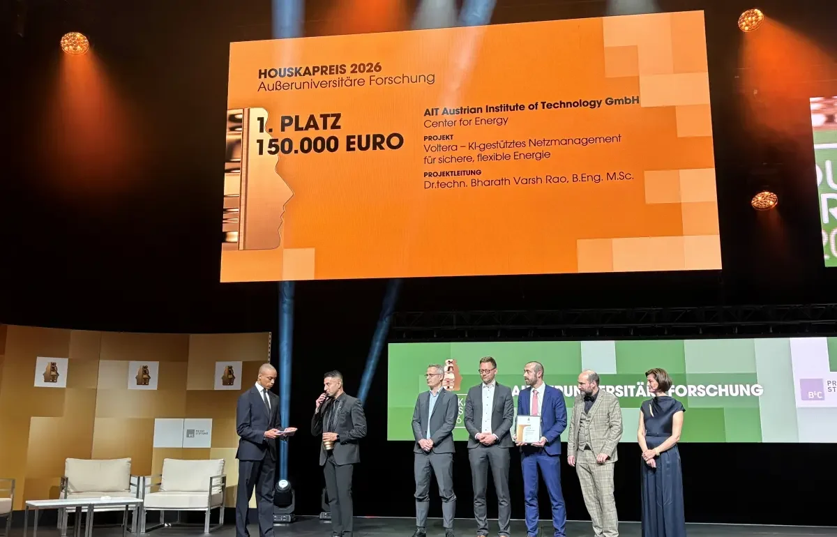 Großer Erfolg für das AIT Austrian Institute of Technology: Das Forschungsprojekt „Voltera“ gewann beim renommierten Houskapreis 2026 in der Kategorie „Außeruniversitäre Forschung“. Die am AIT entwickelte Technologie zeigt, wie künstliche Intelligenz und physikalische Modellierung zusammenwirken können, um Stromnetze fit für die Energiewende zu machen. Die Preisverleihung fand am 21. April im MuseumsQuartier in Wien statt.