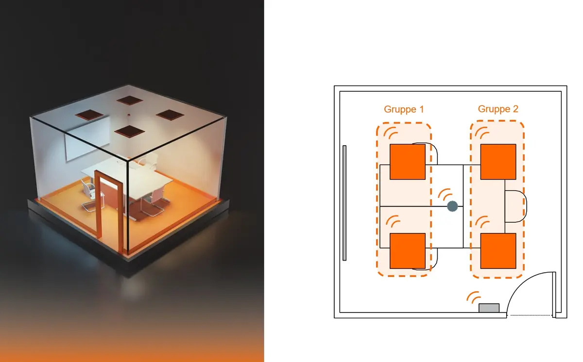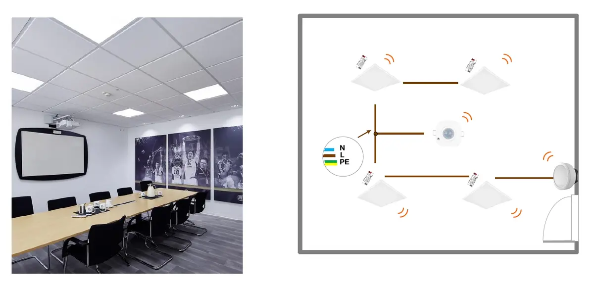Ein mögliches Einsatzszenario findet sich etwa in Büroflächen. Hier lassen sich durch den Einsatz von Präsenz- und Tageslichtsensoren sowohl Energie sparen als auch der Komfort für die Nutzer erhöhen. Die Grundbeleuchtung passt sich automatisch an die Nutzungssituation und das vorhandene Tageslicht an. Über die App können Mitarbeiter zusätzlich Szenen definieren, etwa für Präsentationen, bei denen das Licht gedimmt wird, oder für Meetings, die eine hellere Grundausleuchtung erfordern. Die Einrichtung dauert nur wenige Minuten, da keine aufwendige Netzwerk- oder Serverstruktur berücksichtigt werden muss.